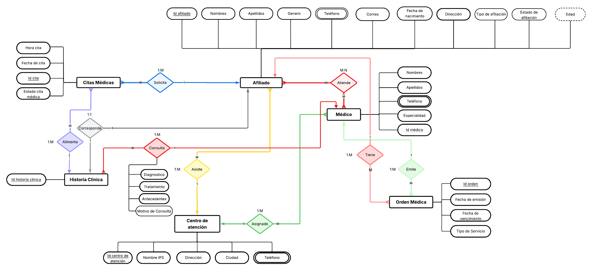 - Un afiliado puede solicitar muchas citas médicas, pero cada cita pertenece a un solo afiliado (1:M).
